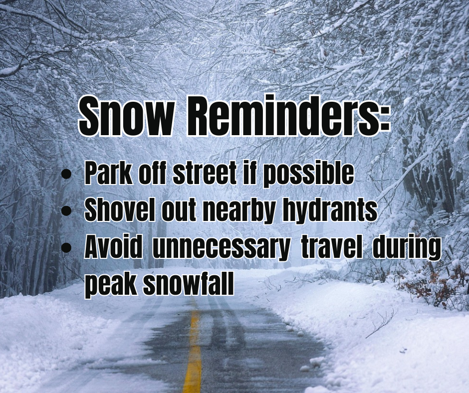 It’s happening again. More snow is inbound ❄️ With that in mind, please help out our clearing crews by parking off street. We also ask that you avoid unnecessary travel during peak snowfall. Shovel out nearby hydrants to ensure first responders have easy access in the event of an emergency. Successful clearing of snow takes all of us working together. We appreciate our residents’ patience & cooperation as our staff work to keep our roads safe.