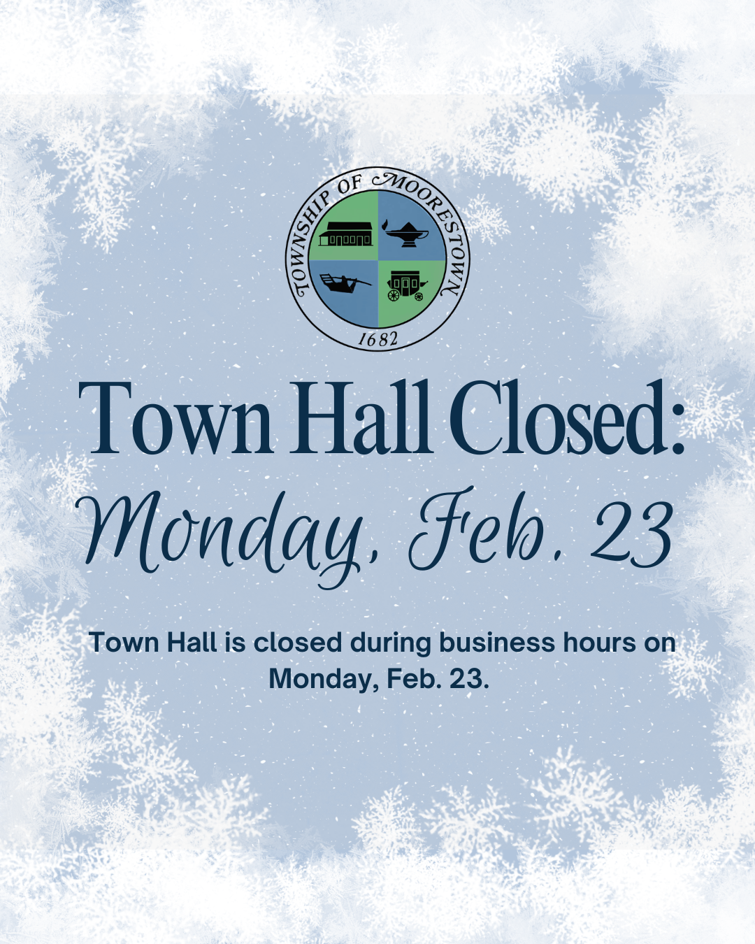 Town Hall is closed during normal business hours on Monday, Feb. 23. Check back for updates on the council meeting scheduled for Monday evening.